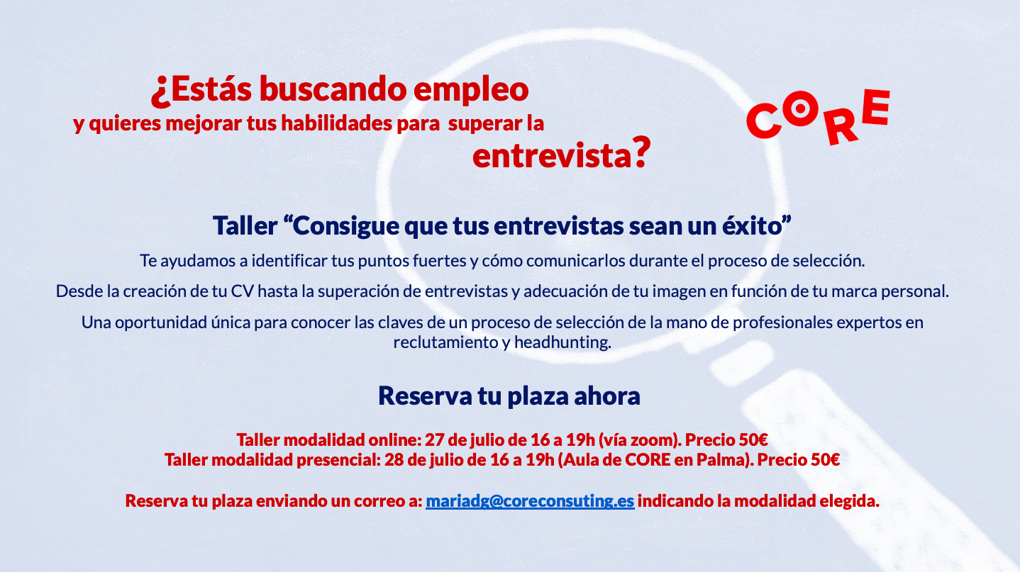 - Taller modalidad presencial: 28 de julio de 16 a 19h (Aula de CORE en Palma).