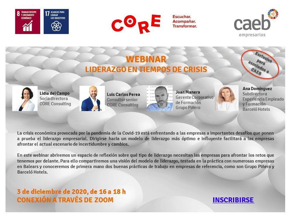En este webinar organizado por CORE consulting y CAEB, Lidia del Campo, Ana Domínguez Amorós, Juan Manera y Luis Carlos Perea reflexionan sobre el tipo de liderazgo necesario en estos momentos.